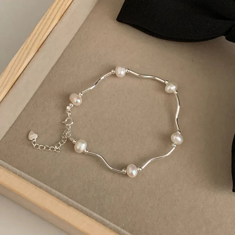 Tic peace wave line minority design sense freshwater pearl S925 pure silver bracelet women commute versatile retro jewelry